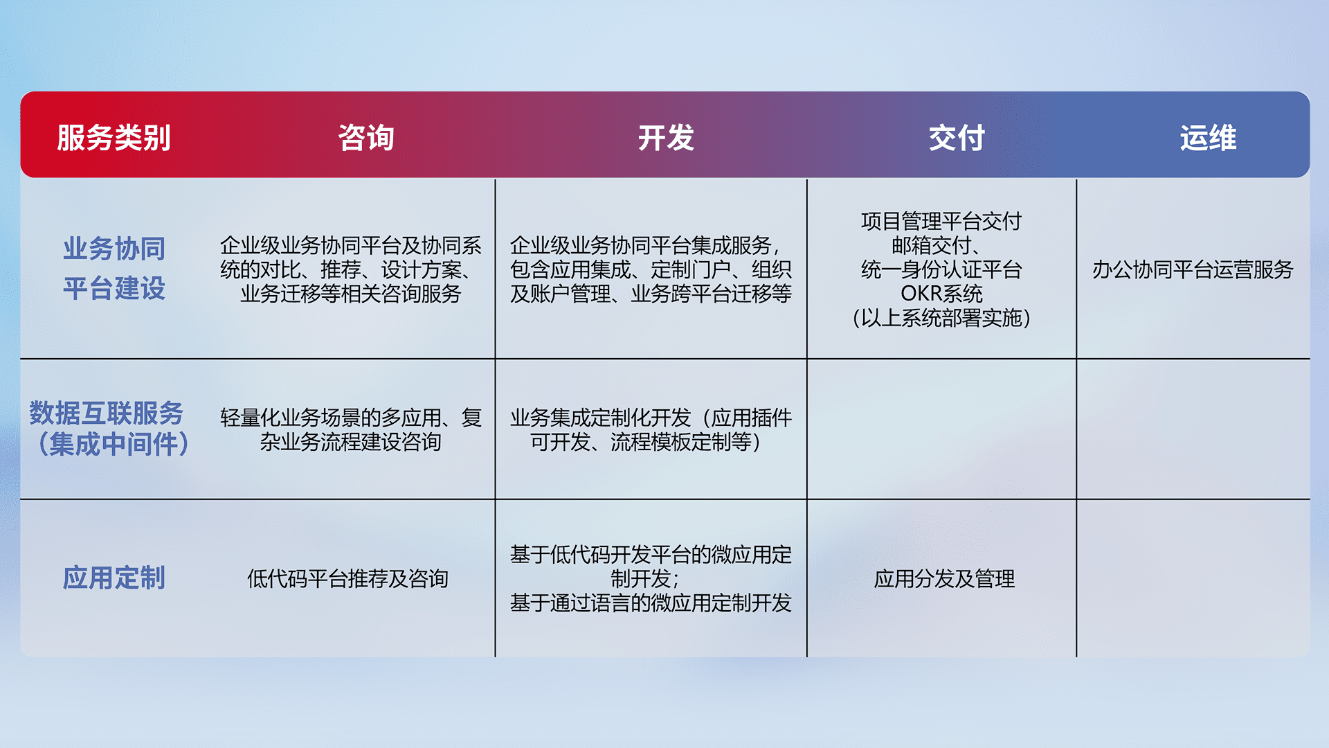 针对钉钉、、、企微、、、IDaas等平台级产品提供产品的规划、、、方案、、、交付、、、、定制化开发等服务,,,,实现如统一协同办公、、、、智能客户服务、、混合会议管理、、、智能数据查询、、、等业务场景,,,实现数字化转型。。。。