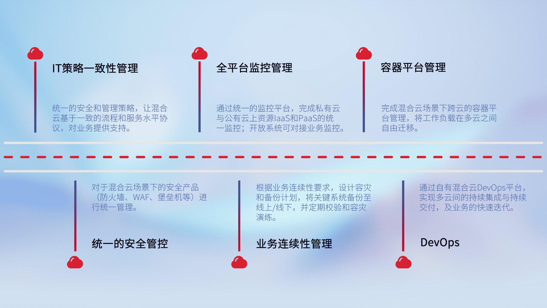 通过多云纳管,,以统一的资源数据模型把客户的云资源进行抽象和封装,,,,进而实现对多云资源的统一操作,,,保障云资源管理的可靠性、、稳定性与可用性。。。量身定制化运维内容,,,配置、、、、开发运维、、补丁管理、、、、备份、、监控、、认证和访问管理、、、、审计和日常巡检等,,保障在用云过程中的可靠度,,稳定度以及高可用率。。。
